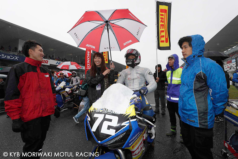そんな裕紀に前戦の岡山ラウンドに続き恵みの雨が降ってくる。日曜日は朝から雨模様となり、路面はウエットコンディションとなる。15分間のウォームアップ走行では4番手につけていたが、それほどいいフィーリングではなかった。ただ、ドライコンディションよりは上位を狙って行ける手応えは感じていた。